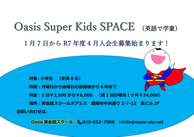2025年度のOasis Super Kids Space (英語で学童)の募集が始まります。